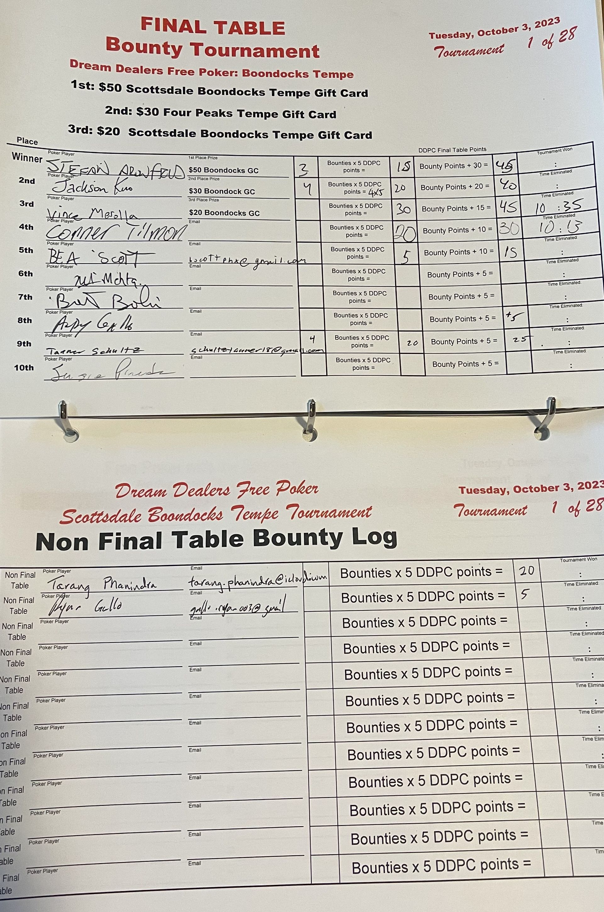 | 3rd | Vince Marolla | 6 Bounties x 5 = 30 | + 15 Final Table Points | 45 Total |